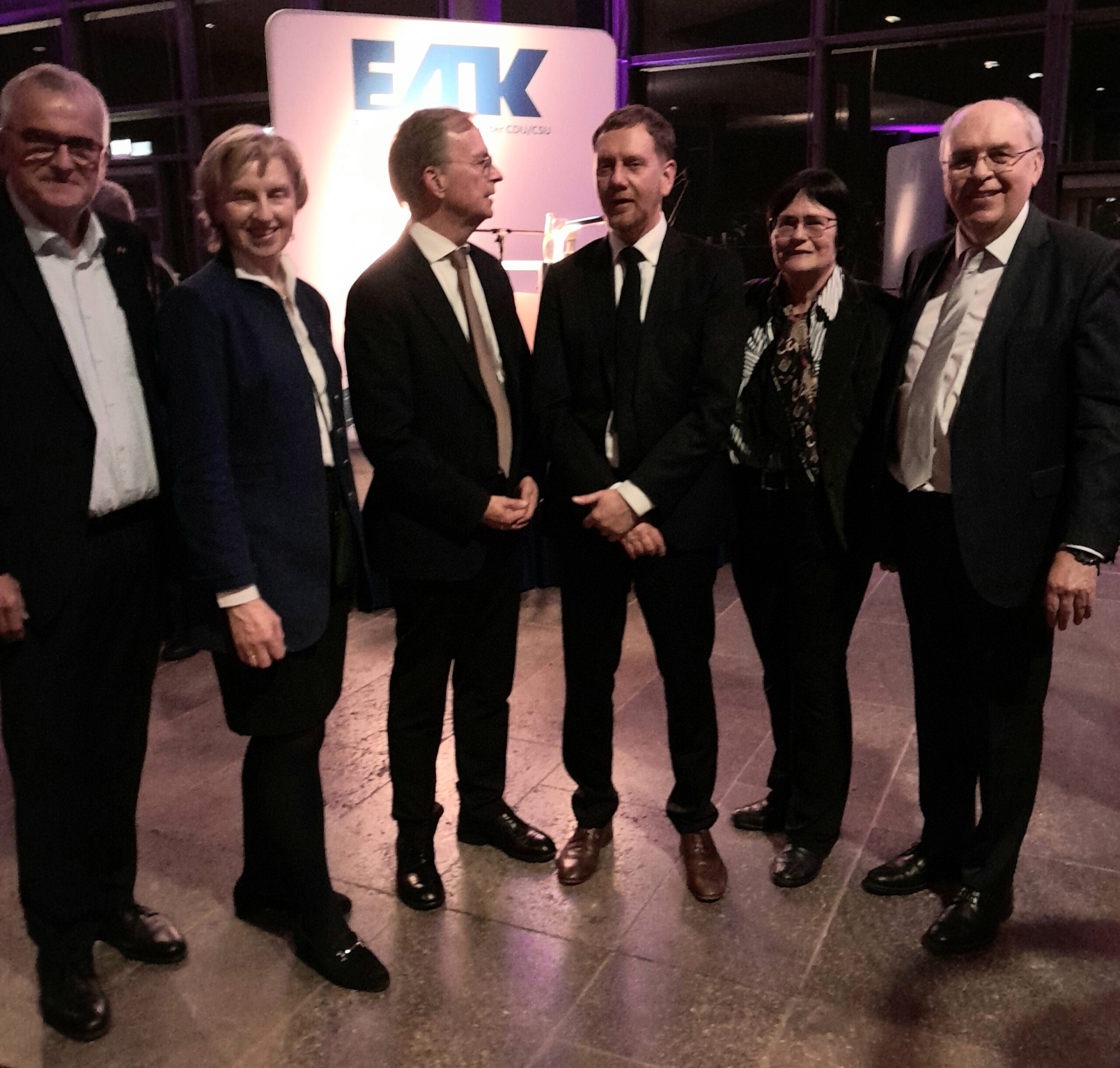 Unterstützung erhielt Thomas Rachel von vielen Weggefährten: Auf dem Foto zum Bespiel sind zu sehen Diakon Hans-Jürgen Hopf aus Bayern und Mitglied des EAK-Bundesvorstandes, Anette Röttger, Mitglied des Landtages aus Schleswig-Holstein, Thomas Rachel, der sächsische Ministerpräsident, Christine Lieberknecht, Ministerpräsidentin a. D. aus Thüringen sowie Dr. Burkhard Budde, stv. Bundesvorsitzender des EAK.